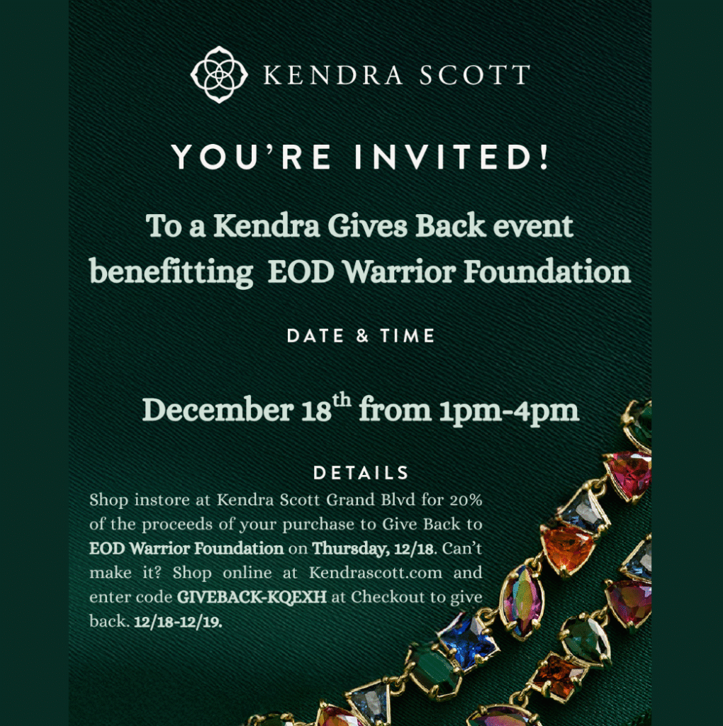 Stop by Kendra Scott at Grand Boulevard on Thursday, December 18th from 1 – 4 PM, where 20% of your purchase will directly support the EOD Warrior Foundation’s mission to assist EOD Warriors and their families.