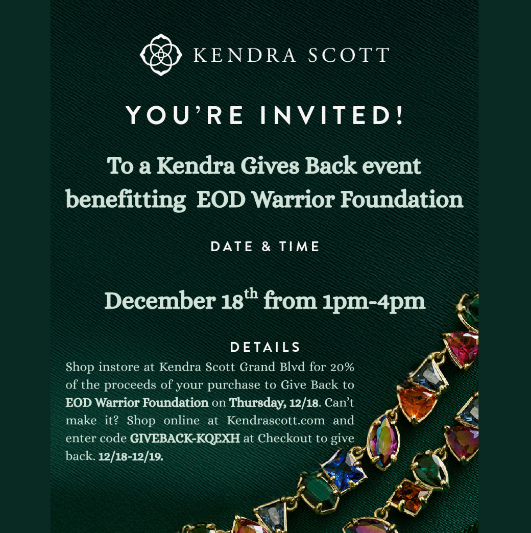 Join us for a special two-day Kendra Scott Give Back Event supporting the EOD Warrior Foundation! 🛍️ Shop In-StoreStop by Kendra Scott at Grand Boulevard on Thursday, December 18th from 1 - 4 PM, where 20% of your purchase will directly support the EOD Warrior Foundation’s mission to assist EOD