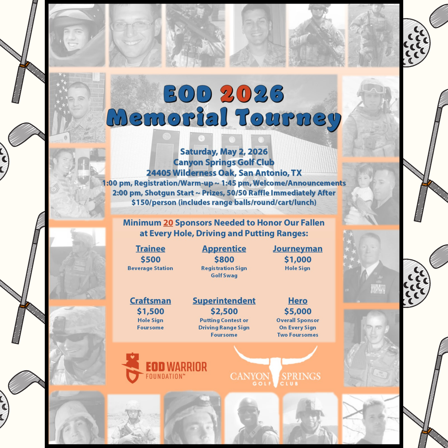San Antonio! We need you on the course.⛳ On May 2nd, join us at Canyon Springs Golf Club for the EOD Memorial Golf Tournament in San Antonio, a day of camaraderie, competition, and remembrance. Held the day after the official EOD Memorial Golf Tournament in Fort Walton Beach, this event